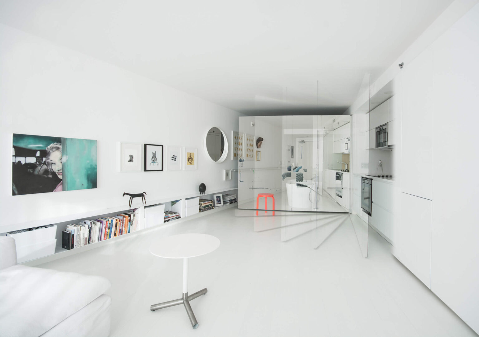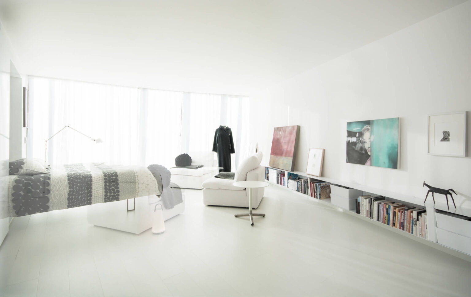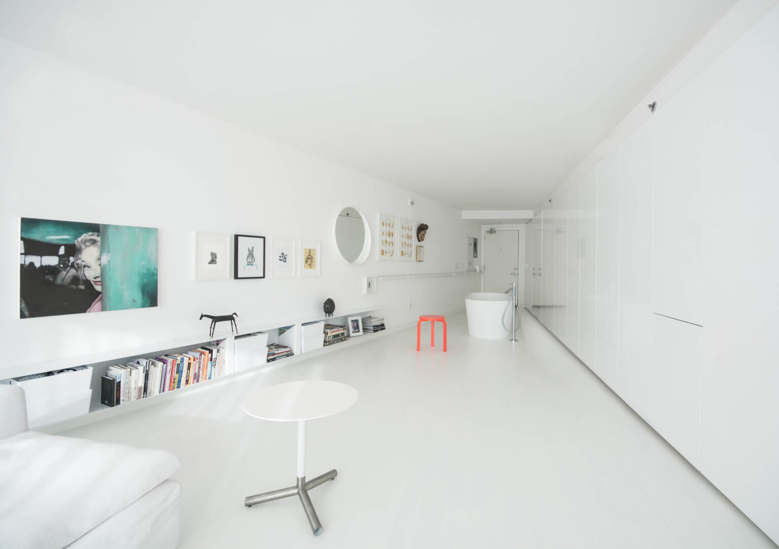The concept for this condominium took minimalism to a whole new level. 0812 worked with the project architect to deliver an entirely hidden program for the end user. The kitchen, bedroom, and closets all ’tuck away’ along one wall for a clean, crisp look.